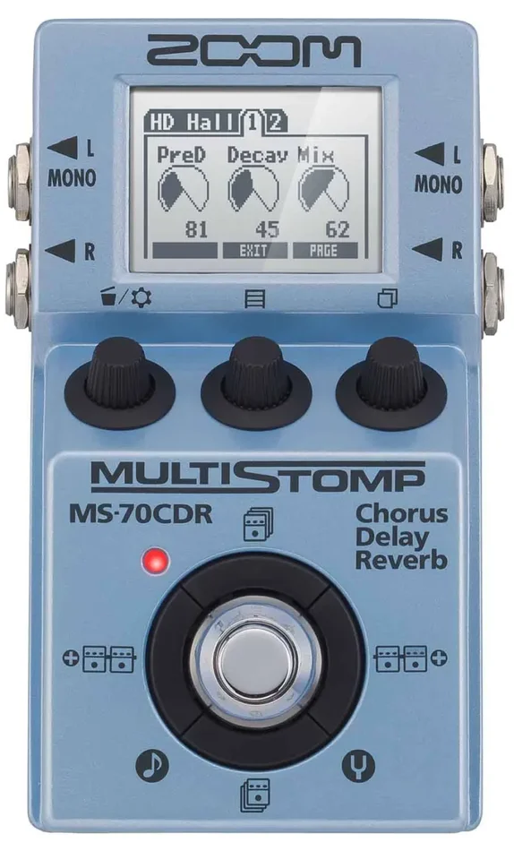 Zoom’s MS-70CDR MultiStomp Chorus, Delay, Reverb pedal is the first of its kind. It provides the full power of a rack-mounted multi-effects device in a compact stompbox design. With its 86 custom guitar and bass effects, an easy-to-use interface, onboard chromatic tuner and versatile power options, you’ll be astonished at how much this little box offers.